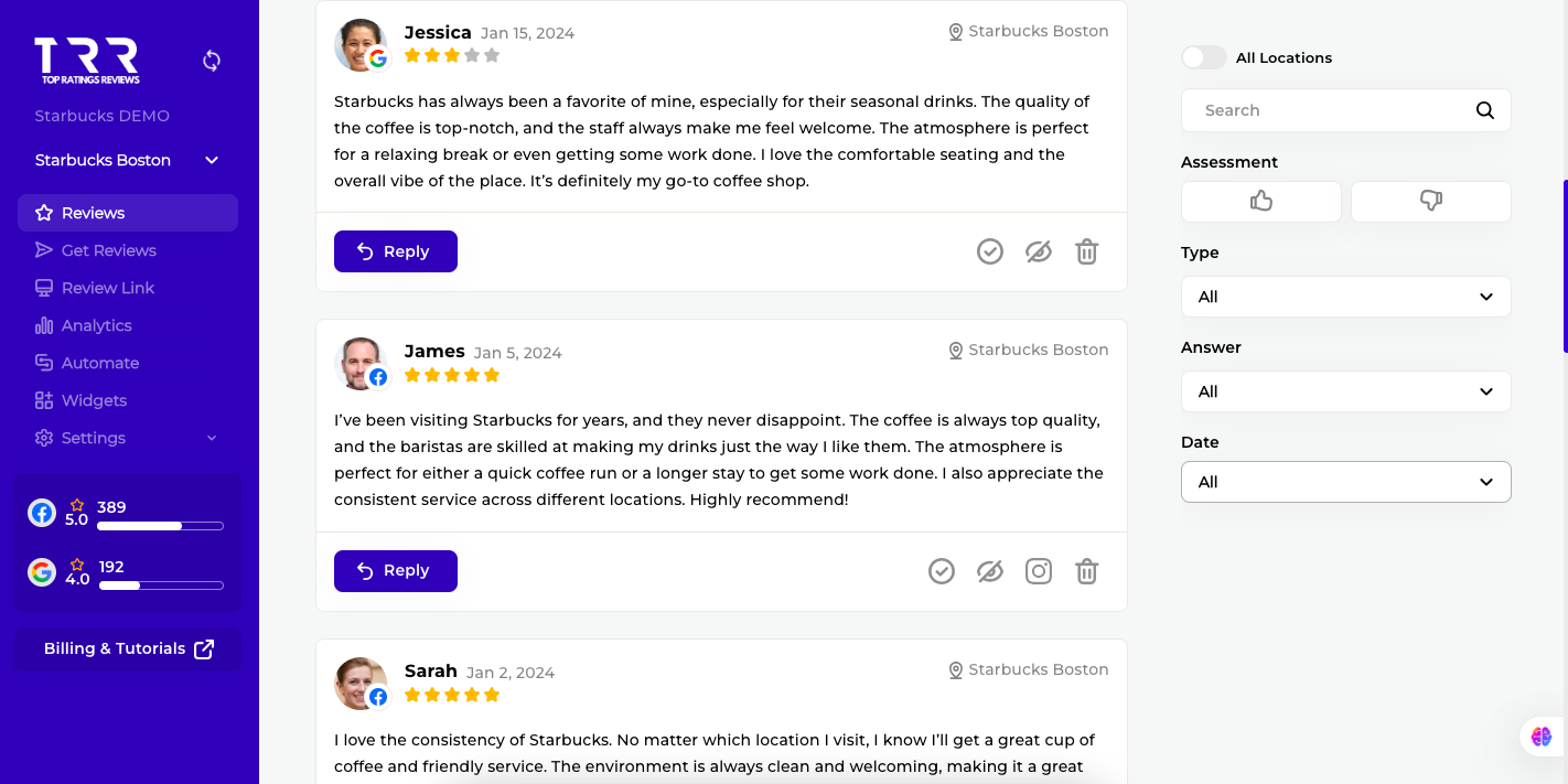 Save time managing your online reputation by seeing your reviews across all your business locations and review sites in a filterable feed. Get real-time alerts of new reviews on Google & Facebook, and draft responses quickly with AI assistance.