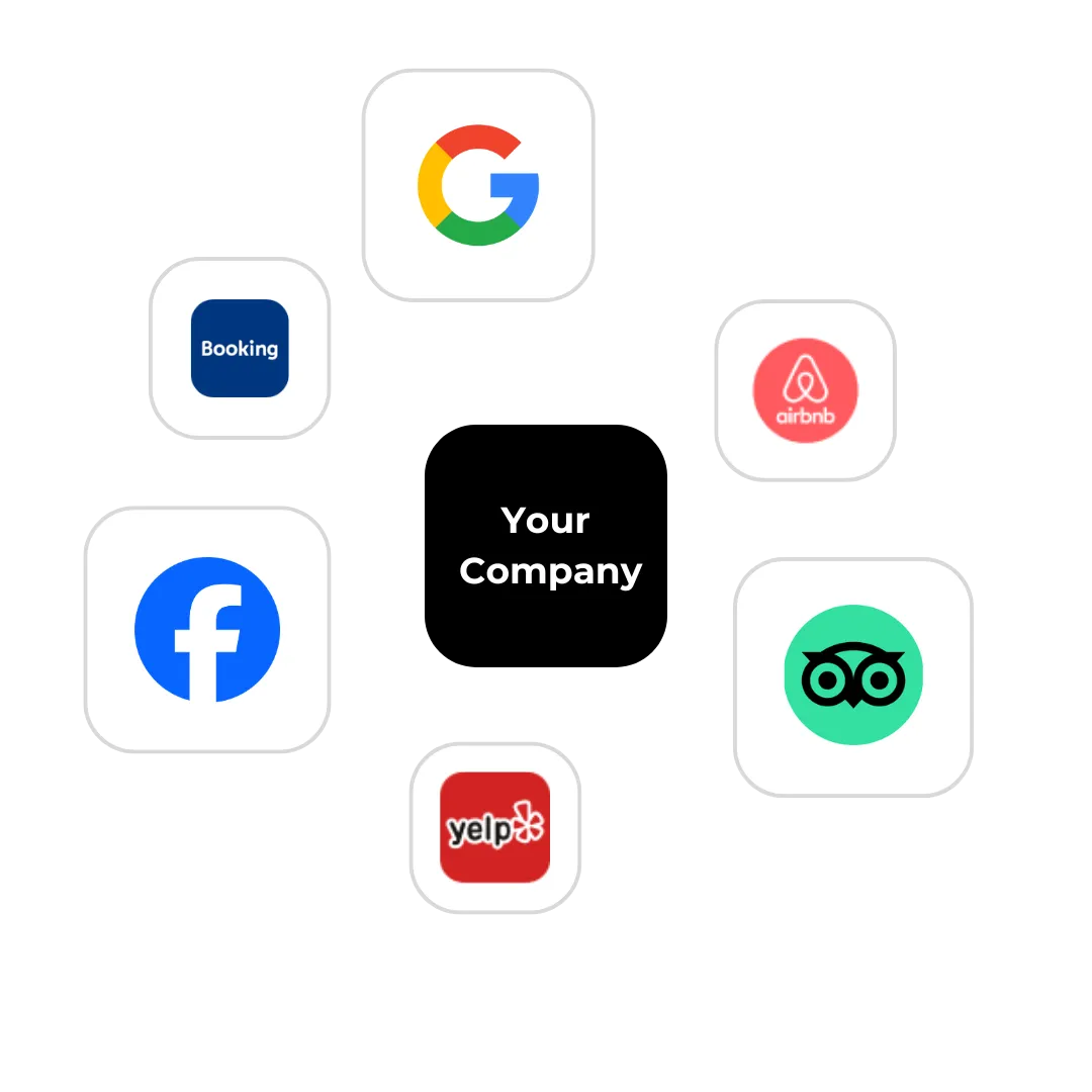 You can integrate with over 40 platforms including: Airbnb, Agoda, Amazon, Angi, AppStore, Awvo, BBB, Booking.com, Capterra, CarGurus, Cars.com, DealRater, eBay, Etsy, Expedia, Facebook, FindLaw, Foursquare, Glassdoor, Google, Google Play, Google Shopping, Healthgrades, HomeAdvisor, Hotels.com, Houzz, Indeed, Lawyers.com, OpenTable, Product Review, RateMDs, Thumbtack, Tripadvisor, Trustpilot, VRBO, WebMD, Yellow Pages, Yelp, Zocdoc, Zomato, Zillow.